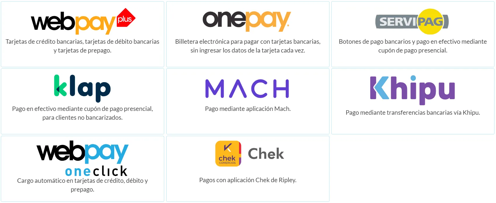 - Tarjetas de crédito, débito y prepago.